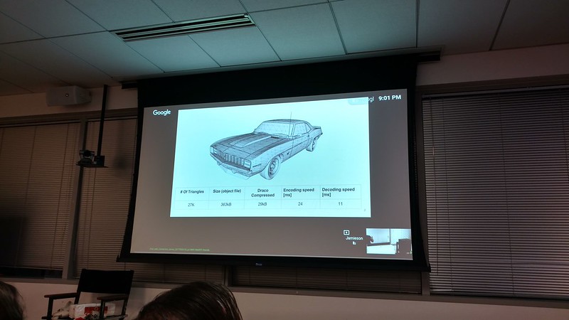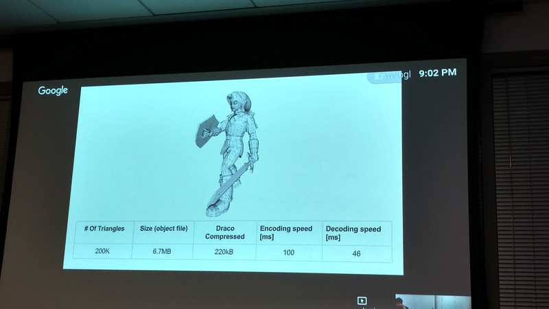 [0900..0930] Jamieson Brettle (Google) - Overview of the Draco project which is focusing on compressing 3D assets for delivery on the web. They are working towards having Draca be part of the glTF2.0 specification.